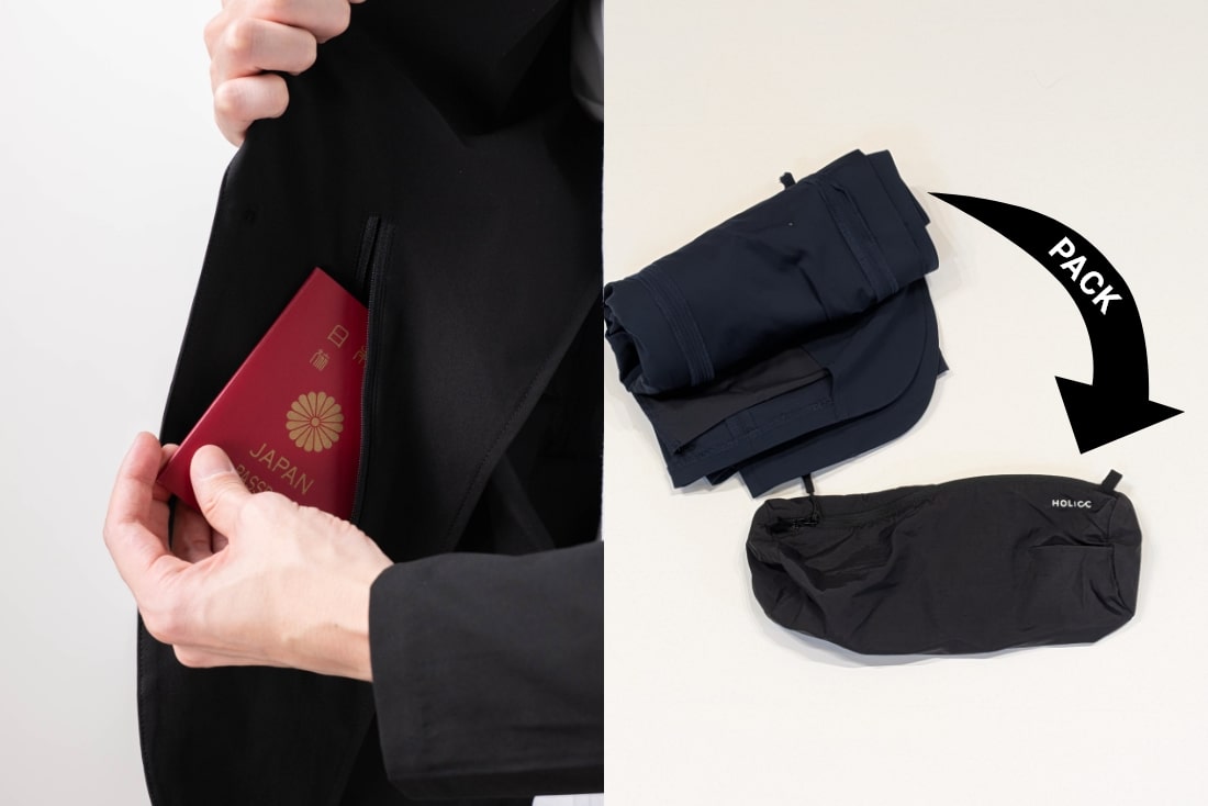 旅も出張も、もっと軽やかに。日常も旅も、快適に過ごしやすく。カード類やパスポートなど、移動時に必要なアイテムをストレスなく取り出せるようポケットを設計。さらにパッカブル仕様。ビジネスでも使えるシルエットでありながら、ストレッチや通気性の高さで着心地が良い素材。適度な厚みと軽さ、シワになりにくい高機能な生地で、シーズン問わずお使いいただけます。