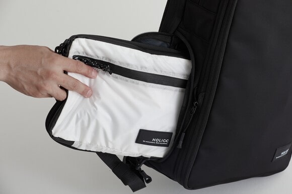 登山家に知られている「重いものを上部に入れると軽く感じる」方法から着想を得て、収納スペースを上下に分けた構造に。さらに背負った際の疲れを軽減させるために、身体にフィットする「低反発・高密度フォーム」を別注しショルダーと背当てに採用しています。
